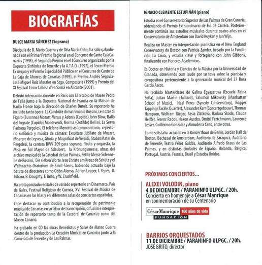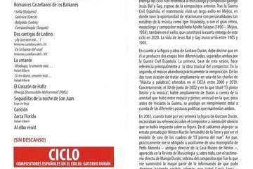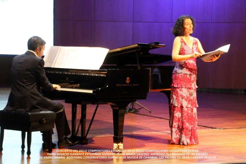 Dos figuras de dos grandes artistas canarios, el pianista Ignacio Clemente Estupiñán, ante el piano Steinway&Sons en el escenario del auditorio del Conservatorio Superior de Música, y con la extraordinaria voz soprano de Dulce María Sánchez, ejecutan con brillantez, maestría y profesionalidad de consagrados en piano y canto, garantías del curriculum que les acompaña, fruto de un trabajo, vocación y dedicación, a lo largo de sus vidas, regalando la oportunidad de escuchar composiciones desconocidas para la mayoría, con la interpretación musico vocal de las obras, Canciones de un artista, como lo fue Gustavo Durán, en el siguiente repertorio: Romances Castellanos de los Balkanes: Sofía (Bulgaria). Salónica (Grecia). Belgrado (Serbia). Constantinopla (Turquía). Dos cantigas de Ledino: ¡Ay que non era…! (Anónimo castellano de siglo XV), y En la fuente del rosel (Anónimo castellano del siglo XIV). La amante, de Rafael Alberti -Madruga, la amante mía … y, Si me fuera, amante mía …. El corazón de Hafiz: Khwaja Shamsuddin Mohammad (Hafiz). Seguidillas de la noche de San Juan (Lope de Vega) Canción Zarza Florida (Rafael Alberti). Al alba venid.