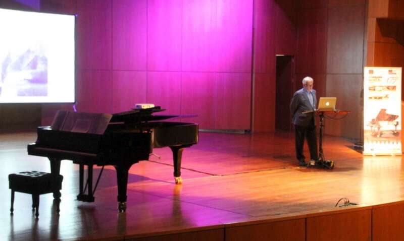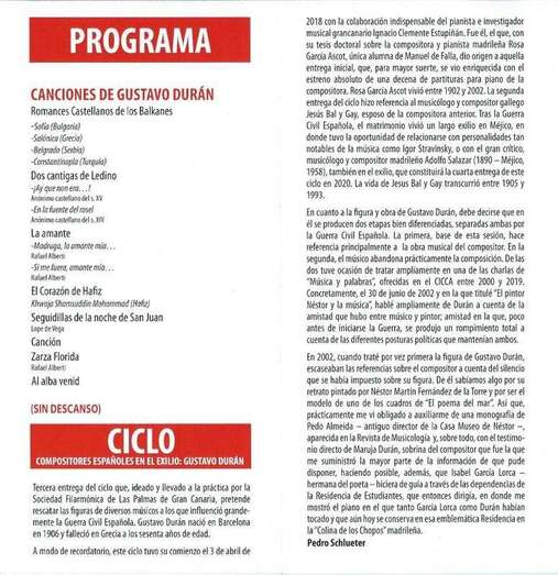 Ante el escenario de este auditorio, Pedro Schlueter expone el proyecto de este Ciclo, que, desde su inicio historiográfico y musical, presenta ya su tercera entrega, texto sintetizado que se informa en el programa de mano que se entrega al público asistente: “Tercera entrega del ciclo que, ideado y llevado a la práctica por la Sociedad Filarmónica de Las Palmas de Gran Canaria, pretende rescatar las figuras de diversos músicos a los que influenció grandemente la Guerra Civil Española. Gustavo Durán nació en Barcelona en 1906 y falleció en Grecia a los sesenta años de edad. A modo de recordatorio, este ciclo tuvo su comienzo el 3 de abril de 2018 con la colaboración indispensable del pianista e investigador musical grancanario Ignacio Clemente Estupiñán. Fue él, el que, con su tesis doctoral sobre la compositora y pianista madrileña Rosa García Ascot, única alumna de Manuel de Falla. Dio origen a aquella entrega inicial, que, para mayor suerte, se vio enriquecida con el estreno absoluto de una decena de partituras para piano de la compositora. Rosa García Ascot vivió entre 1902 y 2002.