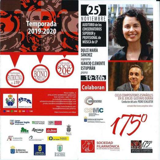 La noche del lunes 25 de noviembre se presentó en el auditorio del Conservatorio Superior de Música de Canarias CSMC, de Las Palmas de Gran Canaria una nueva presentación a cargo de Schlueter, tercera de las de este ciclo, concierto de piano por el teldense Ignacio Clemente Estupiñán, y repertorio de canto por la soprano canaria, Dulce María Sánchez, enmarcado en el Ciclo Compositores Españoles en el Exilio, con interpretación seleccionada de obras del compositor Gustavo Durán.