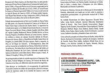 En colaboración con la Sociedad Filarmónica de Las Palmas de Gran Canaria, el concierto, que se desarrolló el pasado 25 de noviembre y fue presentado por Pedro Schlueter, ofreció un repertorio musico vocal dedicado al compositor Gustavo Durán, interpretado por el pianista Ignacio Clemente Estupiñán y la soprano Dulce María Sánchez.