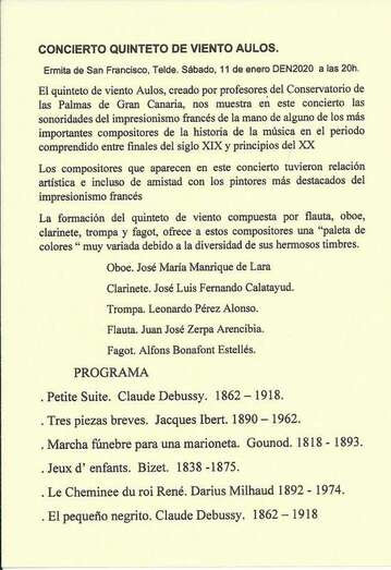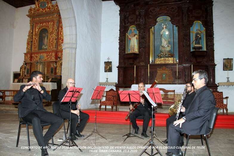 Como primer acto cultural de la programación para el año nuevo en curso 2020, y dentro del tradicional evento musical que el Círculo Cultural de Telde organiza para celebrar la nueva andadura de su agenda como oferta a la ciudadanía en general, socios, socias, amigos y simpatizantes, el sábado 11 de enero de 2020, a las 20:00 hs, ofreció un concierto a cargo del Quinteto de viento Aulos, en la Iglesia Conventual de San Francisco de Telde.