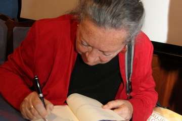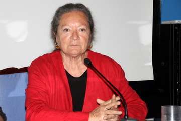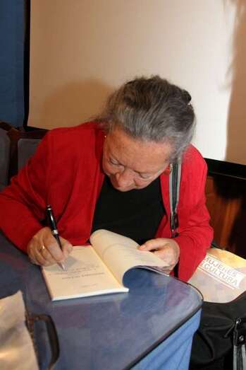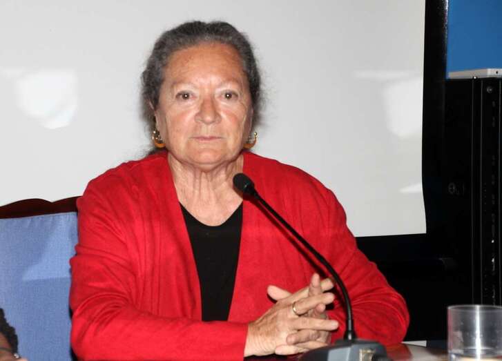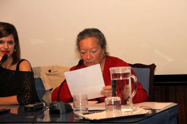 Finaliza su intervención con la lectura del poema dedicado a Guinea - “Guinea era mi mundo”- Mi infancia tiene nombres,/ Río Muni, Santa Isabel…/ el cuento de una boa que devoraba el cielo/ Mi mundo era una playa/ de arenas infinitas/ palmeras que se doblan hasta alcanzar la orilla/ de un océano único sin horizonte alguno/ y un niño de piel negra/ dormido sobre el tronco,/ sus bracillos colgando sobre la miel del agua/ Mi mundo era esa playa…/…Mi mundo era la selva de un elefante herido/ un río en los  cayucos/ sorteando los cuerpos de hipopótamos grises./ Y quedarnos absortos oyendo los tambores /que anuncian nuestro paso/ camino de un poblado/ donde aguardan los viejos/ y sus viejas historias,/ de bosques y elefantes/ que van hacia la muerte./ Oler los cafetales/ escuchar el estrépito enorme de los pájaros,/ oír la algarabía/ de los pequeños monos/ que brincan por los árboles/ y ver cómo maduran la yuca y la malanga/ y devorar el jugo de un coco entre las manos,/ y bailar un ballet al ritmo de tambores/ al compás de la selva/ y sus tristes aullidos./ Aquel era mi mundo/ especial y distinto/ y no habrá ningún otro/ ni yo no seré la misma/”.