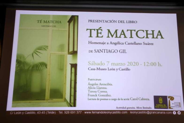 El sábado 7 de marzo tuvo lugar en la Casa Museo León y Castillo un emotivo acto literario en la presentación de la obra Té Matcha del escritor y periodista grancanario Santiago Gil (Guía de Gran Canaria, 1967) licenciado en Ciencias de la Información por la Universidad Complutense de Madrid. Trabaja en medios de prensa y comunicación. Autor de novelas, libros de relatos, numerosas obras, libros de memoria de infancia y artículos de opinión como Psicografías.