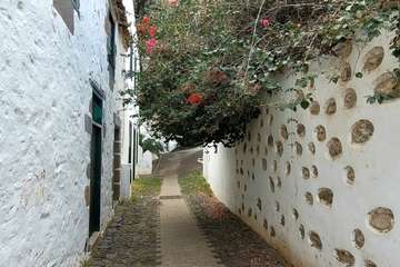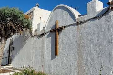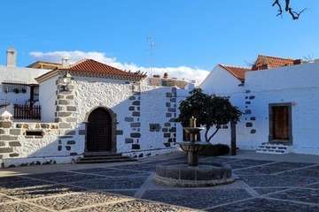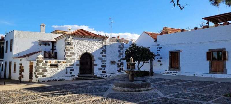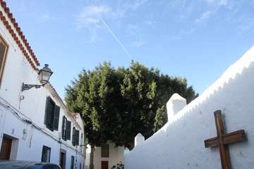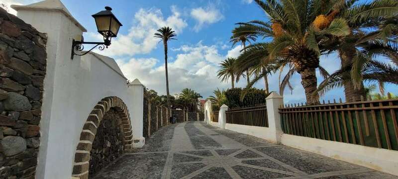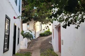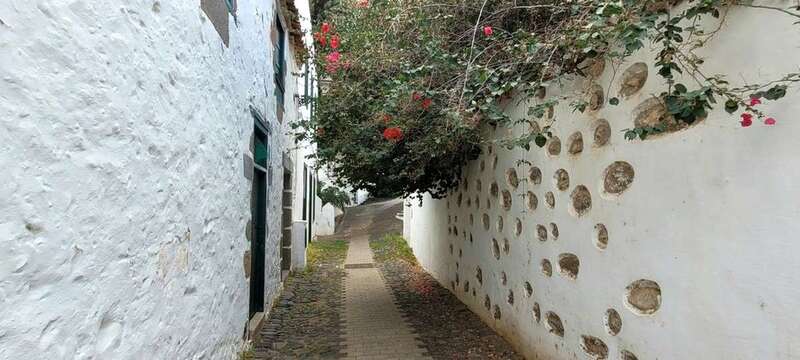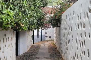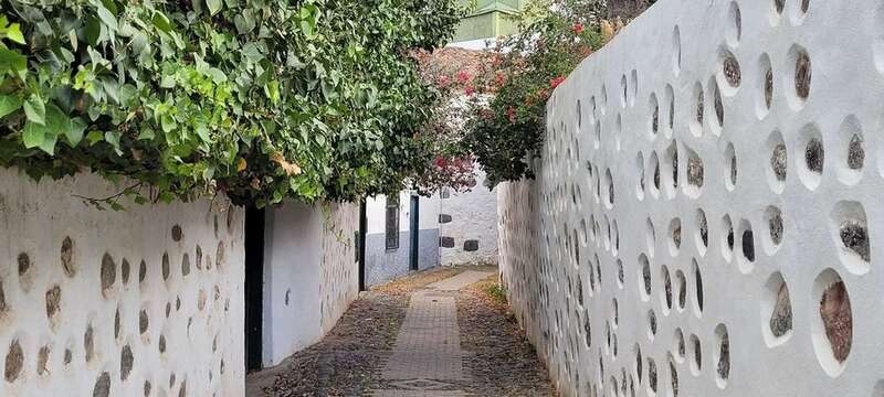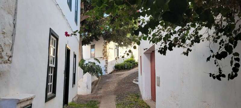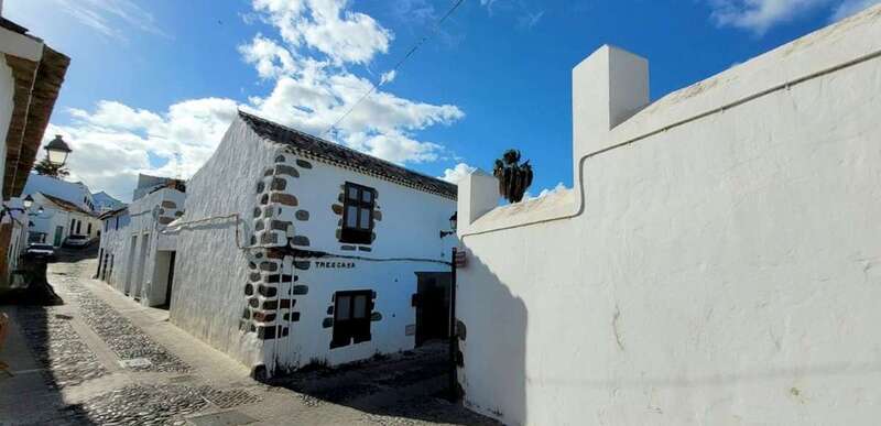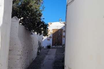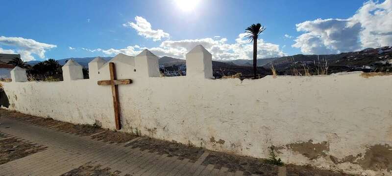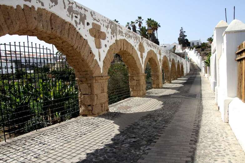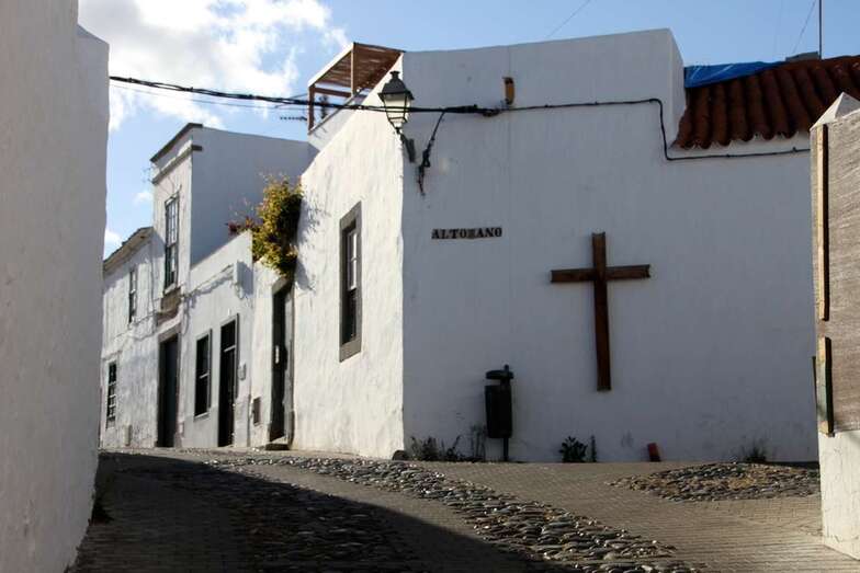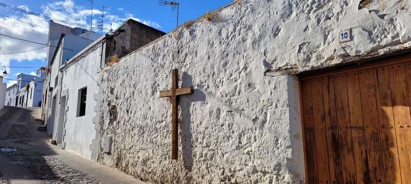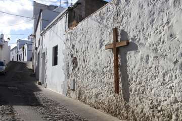 Todos alzan sus brazos al cielo, arcos, muros de piedra seca, portadas, calvario, huertas escalonadas, callejones que escondidos, tímidos, guardan la soledad de su complicidad con portalones y, sin salida, retornan al blanco, tejado a dos aguas, y a las sombras que, sobre amplias paredes, dibujan geranios, buganvillas, hiedras, almenas, cruces y cánigos, ordenados sobre azoteas, fachadas y balcones, asomados, estáticos, adornan los perfiles aéreos en contraste con el cromatismo del celaje que los cubre.