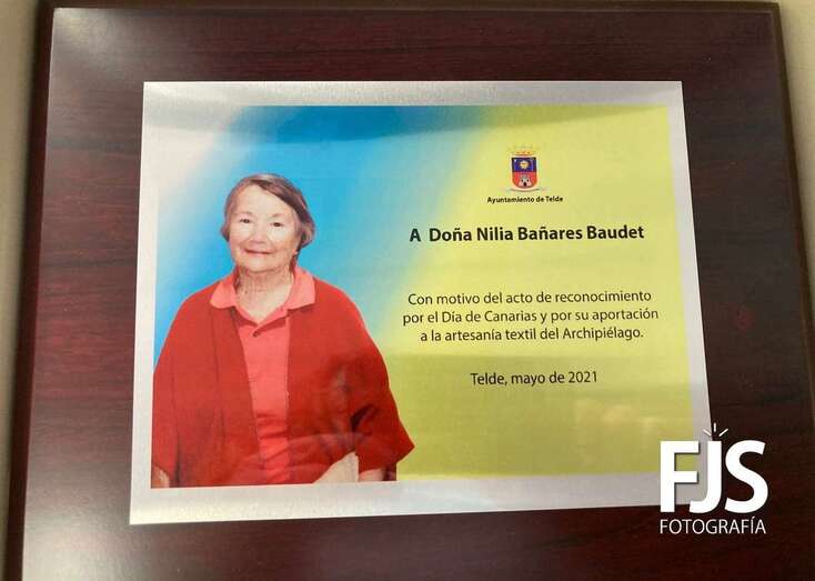 En el acto se homenajeó también a Nilia Bañares Baudet, teldense de adopción y reconocida internacionalmente por su labor artesana e investigadora. Tejedora y tintorera, ha publicado Experiencias con plantas canarias y Hongos tintoreros de Canarias, en cuya reedición trabaja actualmente. Aprendió con Manolito, el tejedor de Tenteniguada, y se formó en Madrid, Inglaterra, Suiza y California, entre otros lugares. Esta experta en tintes naturales con plantas canarias colabora estrechamente como asesora con la Escuela Municipal de Folclore en la puesta en marcha del Centro Etnográfico de las Artesanías de Telde, en la Casa Condal, ofreciéndose incluso a realizar talleres en el mismo.
