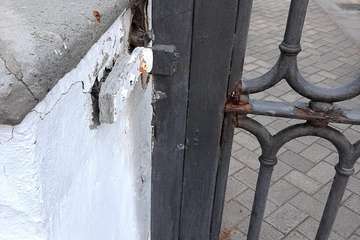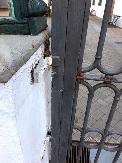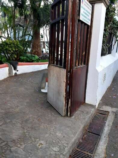 La corrosión se ha comido piezas enteras de la puerta metálica que se mantiene en pie a duras penas, constituyendo un serio peligro para la integridad física de las personas que pasan a diario por ella.