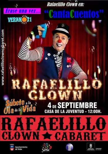 La cita cultural tendrá lugar el próximo sábado, 4 de septiembre, a las 11.00 y 12.00 horas, -doble función debido a la alta demanda recibida- en la Casa de la Juventud, y bajo el título Érase una vez…CantaCuentos Rafaelillo Clown hará disfrutar a las familias asistentes convirtiendo canciones en cuentos y cuentos en canciones acompañado de otros personajes.