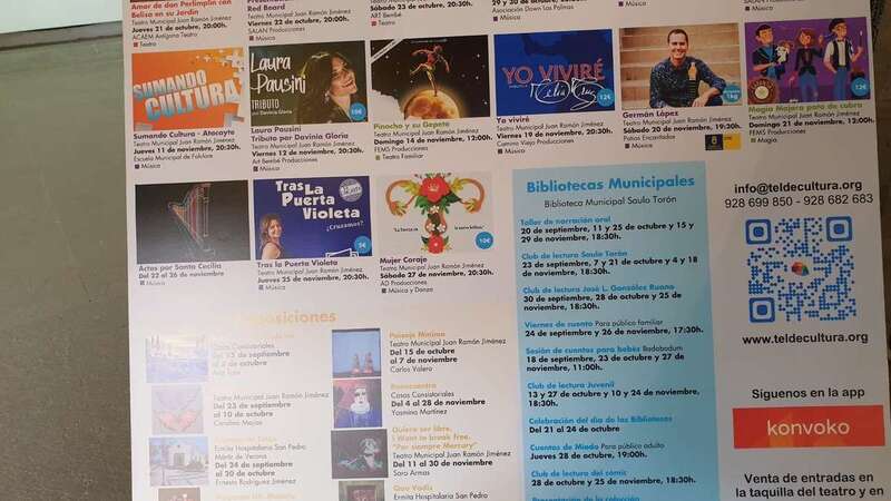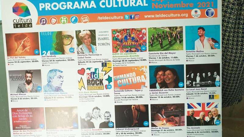 Entre los actos previstos destaca, por ejemplo, el concierto que la mítica banda de rock británica The Animals ofrecerá la noche del sábado 6 de noviembre en el Teatro Municipal Juan Ramón Jiménez (20.00 horas). También la proyección de la película La piel del Volcán, del teldense Armando Ravelo, que ha contado con el apoyo del Ayuntamiento y que se grabó en parte en el municipio (23 de septiembre), los conciertos de Joel Sarakula (24 de septiembre) o Antoñito Molina (1 de octubre); el homenaje a Isabel Torón (25 de septiembre); la celebración de la Noche de los Finaos (31 de octubre); el recital Tras la puerta violeta (25 de noviembre); y las obras Auchi, un espectáculo dolorosamente divertido (26 de septiembre) y Pinocho y su Gepetto (14 de noviembre), entre otros.