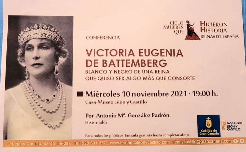 Con la conferencia Victoria Eugenia de Battemberg. Blanco y negro de una Reina que quiso ser algo más que consorte, se culmina el ciclo “Mujeres que hicieron Historia. Reinas de España”, que se ha venido presentando en la Casa Museo León y Castillo de Telde, impartidas por el Historiador y Cronista Oficial de Telde, Académico Correspondiente de la Real de la Historia, Antonio María González Padrón. Como todas, esta última intervención del historiador trató la temática biográfica e histórica de sus protagonistas reales, con la intención de arrojar luz sobre biografías de mujeres que habían pasado a la historia como consortes Reinas de España, salvo Isabel II que ostentaba el trono, y, que muy preparadas, algunas mejores que sus regios maridos.