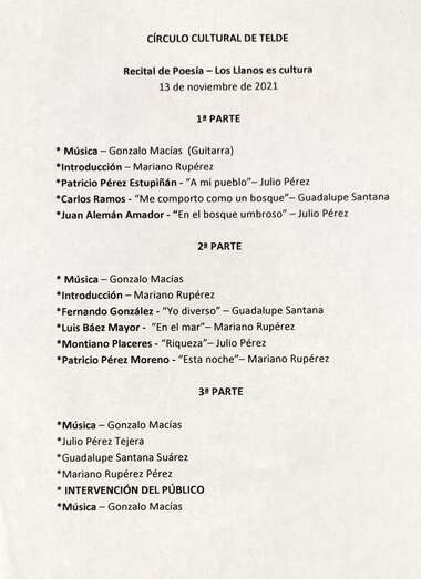 Llegados al final del recital se propone desde la mesa de presentación la intervención del público asistente, para compartir la lectura de poemas en los que han puesto su interés por dar a conocer, y contar con la presencia, entre otros, de los escritores, poetas, Pino Monzón Padrón, Adolfo García y José Juan Mújica, desde siempre y en la antigua sede del Círculo Cultural, asiduos visitantes de las veladas poéticas, presentaciones de libros, dinámicos culturales, artífices y participantes de los festivales poéticos realizados en Telde, dedicados al poeta Luis Natera Mayor.