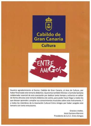 Jesús Santana Marrero, presidente de la Asociación Cultural Entre Amigos, ha querido felicitar a Carmelo Santana por la publicación altruista de este libro y por su dedicación “para hacer llegar a todos los que desean aprender y ampliar sus conocimientos musicales sobre este instrumento”.