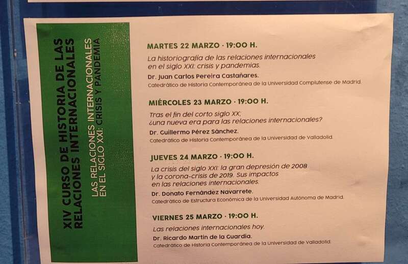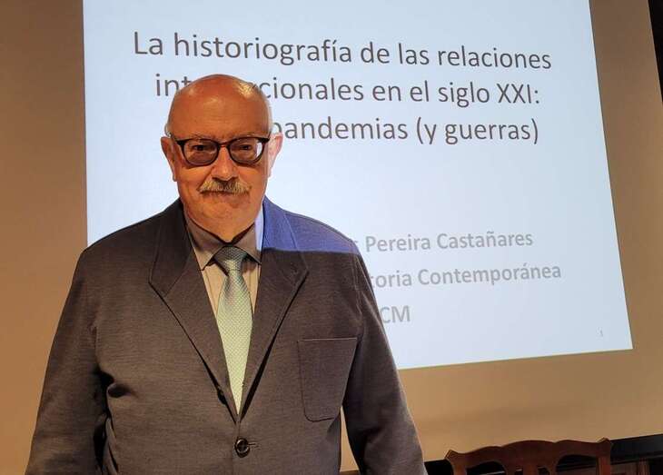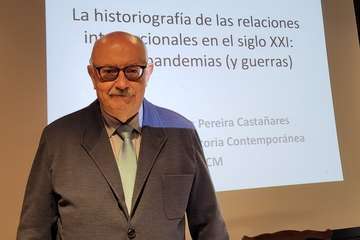 Se inicia la primera ponencia el martes con la intervención del Profesor Dr. Juan Carlos Pereira Castañares, catedrático de Historia Contemporánea de la Universidad Complutense de Madrid, que con el título de La Historiografía e las relaciones internaciones en el siglo XXI: crisis y pandemias (y guerras) aborda el recorrido histórico de su ponencia citando al historiador británico Eric Hobsbawm que señalaba al siglo XX como “corto” a la vista de los acontecimientos, procesos históricos y resultados desde 1914.