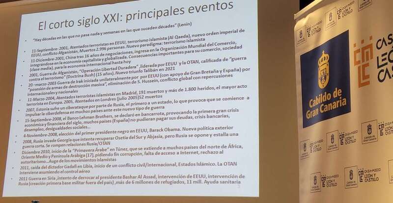En esta línea que a modo de observadores e interesados en la raíz del porqué de los hechos que causan estos conflictos, circunstancias, escenarios, actores protagonistas de la acción y sus consecuencias, nos traen a esta tribuna de la Casa Museo León y Castillo, organizadora del ciclo en colaboración con la Universidad de las Palmas de Gran Canaria, Facultad de Geografía e Historia, una nueva edición del XIV Curso de Historia de las Relaciones Internacionales, bajo la dirección del catedrático, profesor titular de Historia Contemporánea de la ULPGC , Dr. Javier Ponce Marrero.