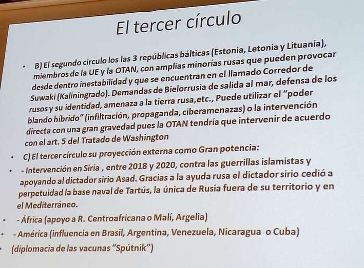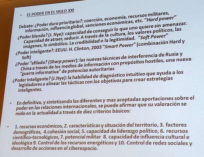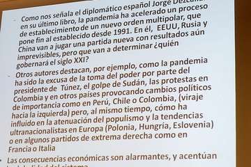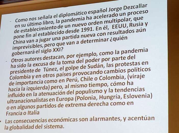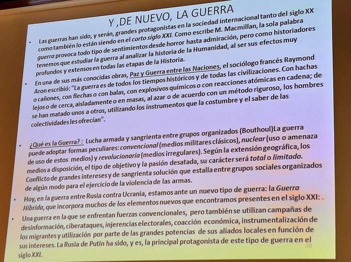 Extensa y brillante intervención del Dr. Juan Carlos Pereira que ahondó en los significados, reflexiones y conceptos como: El Poder en el siglo XXI. Reflexiones sobre el Orden, el Poder y el Sistema Internacional. Hechos que marcan un cambio de tendencia, la pandemia y la guerra de agresión de Rusia sobre Ucrania. El fortalecimiento de la realidad estatal como actor central del sistema. Auge del populismo y la extrema derecha, crisis democrática. Desigualdad entre las sociedades. La distribución del PIB en el mundo. Las economías más grandes del mundo a lo largo del tiempo. Revolución digital y ciberespacio. Rusia ¿el porqué de la guerra? El proyecto neoimperial de Putin. El tercer círculo. Consecuencias inmediatas de la guerra. Los refugiados.