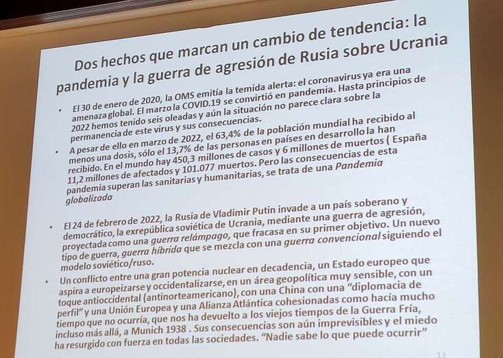 Provistos de esos análisis y perspectivas históricas, esta edición de los cursos de historia de las relaciones internacionales pretende someter a reflexión y debate las crisis, de distinta naturaleza y calado, a las que nos enfrentamos en 2022: la superación de una pandemia que parece no terminar, y que impactó de lleno sobre una economía mundial que todavía no se había recuperado totalmente del crack de 2008; y la conmoción por la invasión rusa de Ucrania, en una reedición de la vieja Realpolitik, que a buen seguro provocará profundas pero todavía inciertas consecuencias en el escenario económico y político internacional, en el corto, pero también en el medio y largo plazo, dibujando una nueva frontera en el devenir histórico europeo y mundial, como pocos acontecimientos en las últimas décadas.