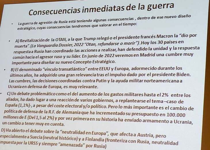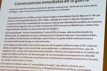Un conflicto entre una gran potencia nuclear en decadencia, un Estado europeo que aspira a europeizarse y occidentalizarse, en un área geopolítica muy sensible, con un toque antioccidental (antinorteamericano), con una China con una “diplomacia de perfil” y una Unión Europea y una Alianza Atlántica cohesionadas como hacía mucho tiempo que no ocurría, que nos ha devuelto a los viejos tiempos de la Guerra Fría, incluso más allá, a Múnich 1938. Sus consecuencias son aún imprevisibles y el miedo a resurgido con fuerza en todas las sociedades. “Nadie sabe lo que puede ocurrir”.