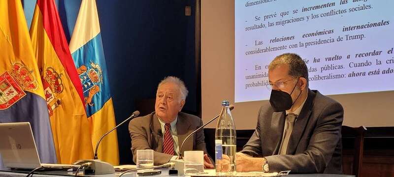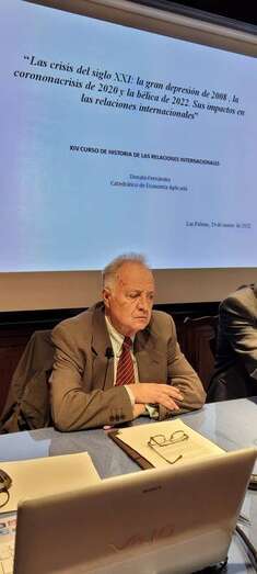 El profesor Ponce Marrero expresa: La conferencia de esta jornada, tercera de las ponencias, que con el título “Las crisis del siglo XXI: la gran depresión del 2008, la coronavirus de 2020 y la bélica de 2022. Sus impactos en las relaciones internacionales” será impartida por el profesor Dr. Donato Fernández Navarrete, Licenciado en Economía por la Universidad Complutense, doctor por la Universidad Autónoma de Madrid, donde ha desarrollado toda su actividad docente desde 1984 como Catedrático de la misma. Ha impartido docencia en tres cursos académicos como catedrático de La Sorbona en París 3 y ha sido profesor visitante en la Universidad de Misuri, Columbia, Pernambuco, Brasil, Universidad Nacional Autónoma de Nicaragua, en el Instituto de Relaciones internacionales de la Universidad de Chile, en West Timisoara en Rumanía y también invitado por el Ministerio de Educación de Japón para impartir conferencias en la Kyoto University en Tokio, y estamos ante un consumado especialista, maestro en su actividad investigadora y docente. Ha dirigido y participado en numerosos proyectos de investigación, ponente en más de 50 Congresos nacionales e internacionales. Ha organizado numerosos cursos de verano en universidades españolas y ha sido conferenciante en centros públicos y privados españoles e internacionales.