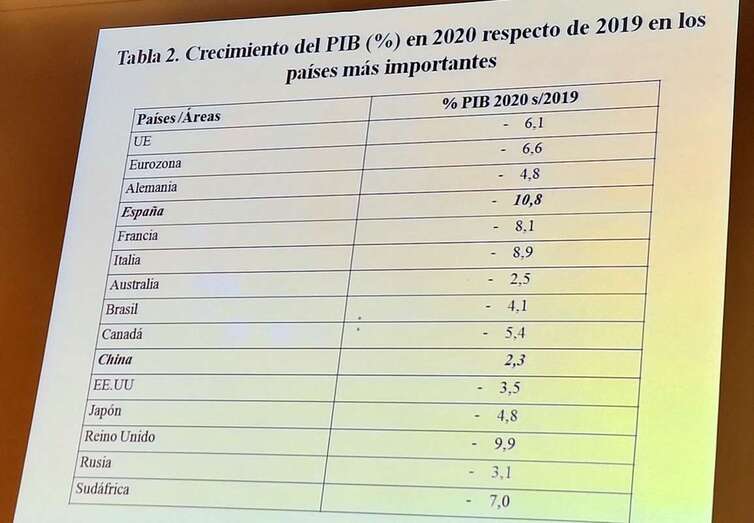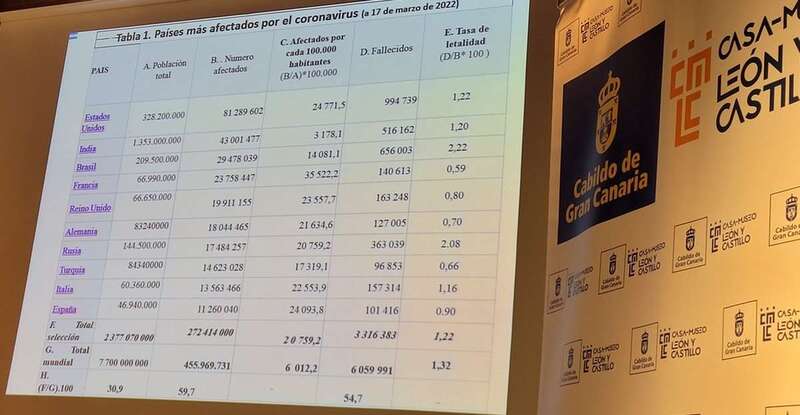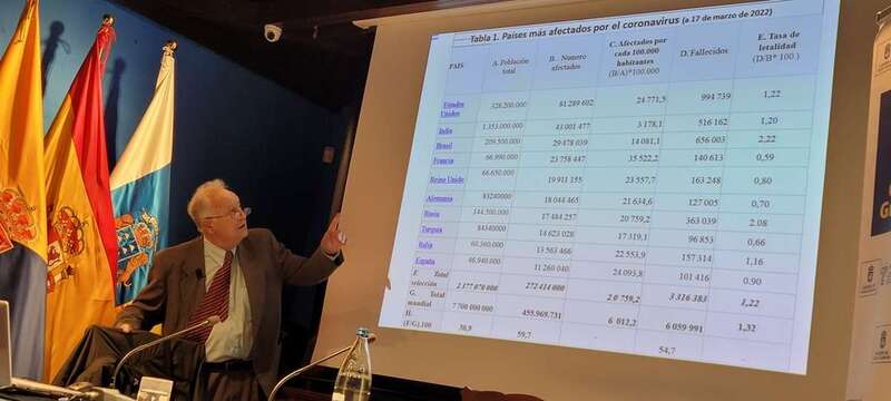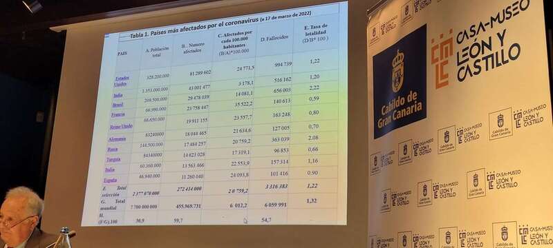 Después de presentar en proyección muestras estadísticas de los países más afectados por el coronavirus entre: Estados Unidos, India, Brasil, Francia, Reino Unido, Alemania, Rusia, Turquía, Italia, España en su población total de la selección 2.377.070.000 y el total de la Humanidad, 7.700.000.000, muestra el total de afectados por la evolución de la pandemia y afectados por cada 100.00 habitantes, fallecidos y tasa de letalidad, que da idea de la gravedad siendo una de las causas sanitarias de la crisis de este 2022 como bien se expone al inicio de la conferencia. Expuestas en otra tabla el crecimiento del PIB (%) en 2020 respecto a 2019 en los países más importantes, puntualizando el retroceso negativo de los países indicados, con la curiosa excepción de China, un 2,3% positivo. Causas económicas originadas por la crisis.