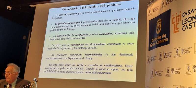 En su conclusión el Dr. Fernández Navarrete expone ante esta situación el posible horizonte que se nos presenta como consecuencias a largo plazo de la pandemia: El mundo económico que se avecina será diferente al que hemos conocido hasta ahora. La globalización proseguirá, pero experimentará ciertos cambios, sobre todo en la deslocalización de la producción de actividades esenciales, que serán más protegidas por los Estados. La digitalización, la robotización y otras tecnologías, alcanzarán unas dimensiones hasta ahora desconocidas. Se prevé que se incrementen las desigualdades económicas y, como resultado, las migraciones y los conflictos sociales. Las relaciones económicas internacionales se han deteriorado considerablemente con la presidencia de Trump. En esta crisis nadie ha vuelto a recordar el neoliberalismo. Existe unanimidad en pedir ayudas públicas. Cuando la crisis se supere, con toda probabilidad, resurgirá el neoliberalismo: ahora está adormecido.