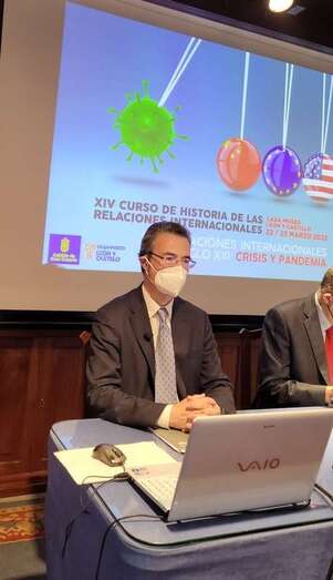 Título de la ponencia que desde hace justo dos años antes de la pandemia que se iba a realizar aquí y se tuvo que suspender, y en aquel contexto era menos temerario porque aunque la crisis 2008-09 estaba y continuaría estando presente en el ámbito político, social, económico y, por supuesto, en las incidencias de las relaciones internacionales, pero sin haber concatenado esas crisis sucesivas, como bien expuso en su ponencia el profesor Donato Fernández Navarrete, desde la perspectiva económica, y como decimos los historiadores, en la aceleración de los acontecimientos, crisis que con una dimensión mundial que, inevitablemente, hace que en un espacio cronológico muy corto cambien o se modifiquen comportamientos, tendencias que parecían muy estables en ese siempre panorama inestable de las relaciones internacionales.