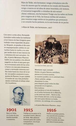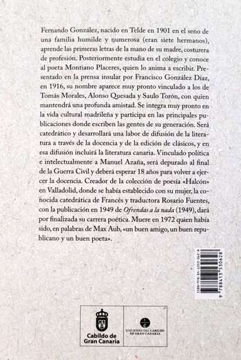 Anotación biográfica contraportada libro: “Fernando González, nacido en Telde en 1901 en el seno de una familia humilde y numerosa (eran siete hermanos), aprende las primeras letras de la mano de su madre, costurera de profesión. Posteriormente estudia en el colegio y conoce al poeta Montiano Placeres, quien lo anima a escribir. Presentado en la prensa insular por Francisco González Díaz, en 1916, su nombre aparece muy pronto vinculado a los de Tomás Morales, Alonso Quesada y Saulo Torón, con quien mantendrá una profunda amistad.