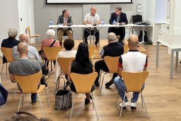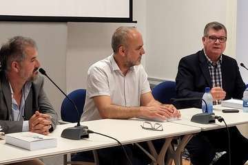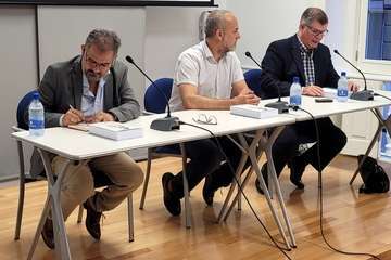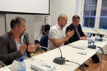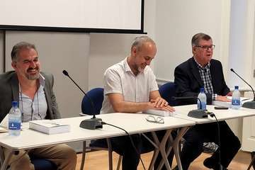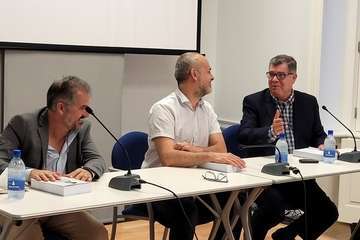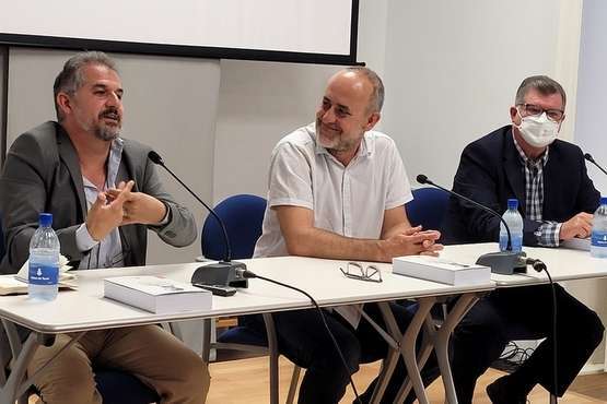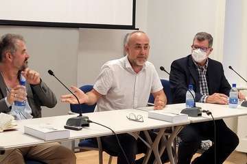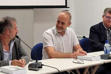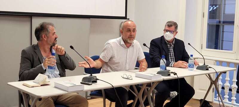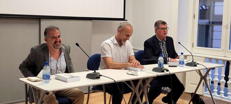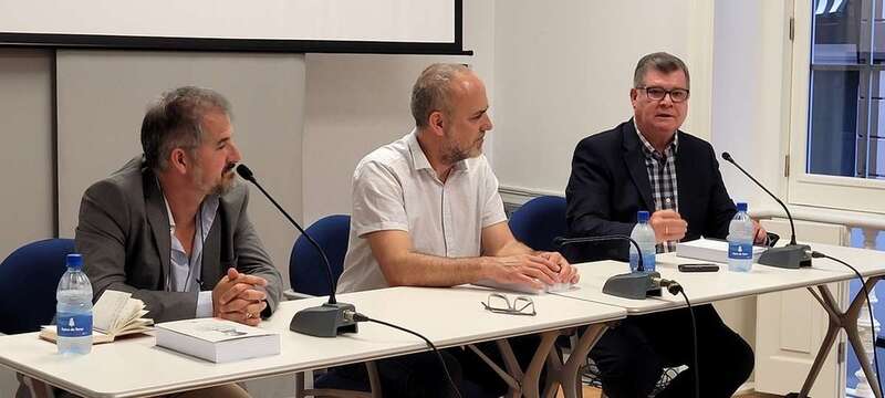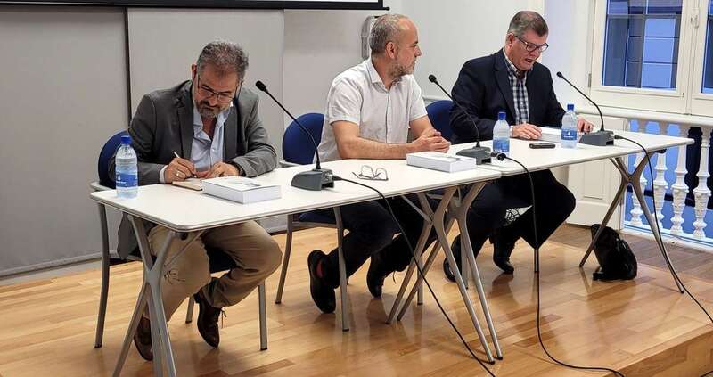 Presiden la mesa de presentación, Francisco José Bravo de Laguna, director insular de Cultura del Cabildo de Gran Canaria, Antonio María González Padrón, historiador, escritor, ex director de la Casa Museo León y Castillo y cronista oficial de Telde, y el profesor Antonio Becerra, autor de la obra presentada y comisario de la Exposición que se inaugura: Fernando González una vida escrita.