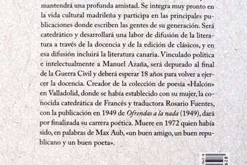Vinculado políticamente a Manuel Azaña, será depurado al final de la Guerra Civil y deberá esperar 18 años para volver a ejercer la docencia. Creador de la colección de poesía Halcón en Valladolid, donde se había establecido con su mujer, la conocida catedrática Rosario Fuentes, con la publicación en 1949 de Ofrendas a la nada (1949), dará por finalizada su carrera poética. Muere en 1972 quien había sido, en palabras de Max Aub, “un buen amigo, un buen republicano y un buen poeta”.
