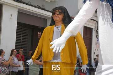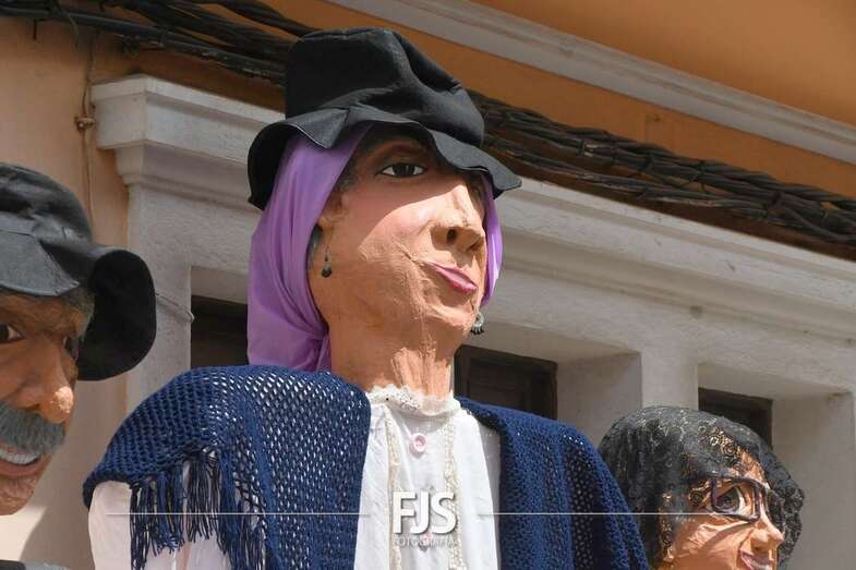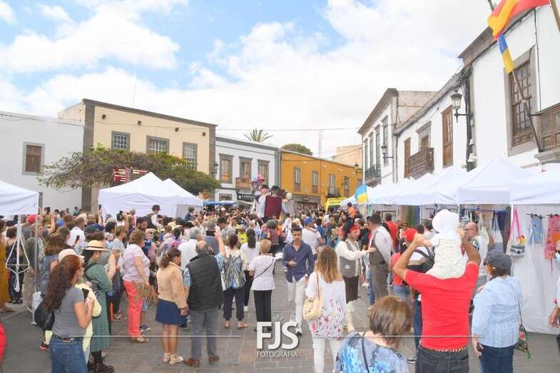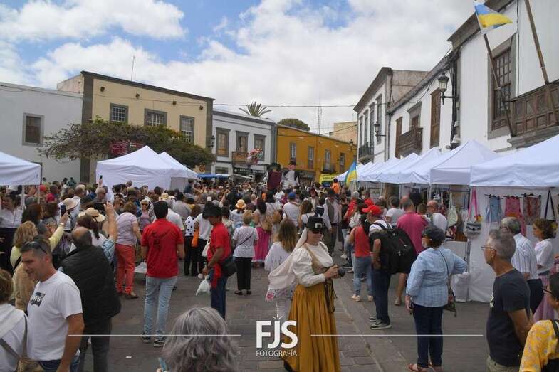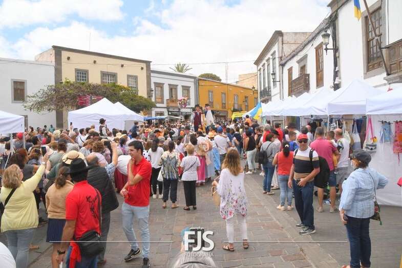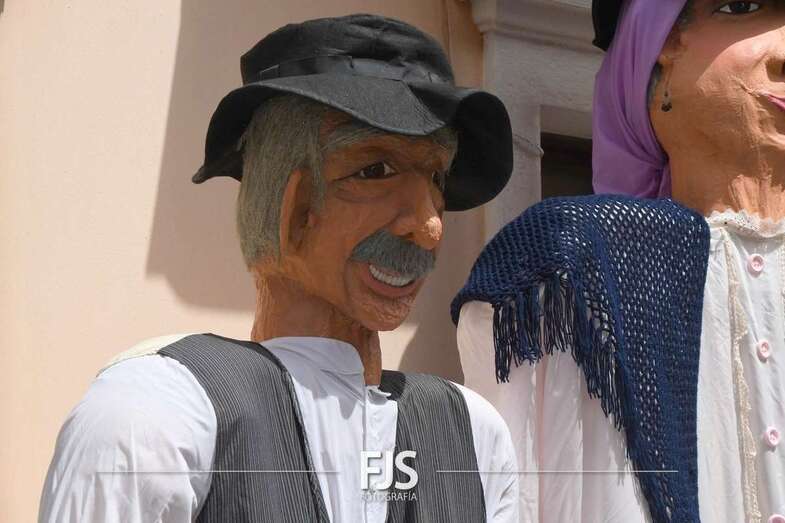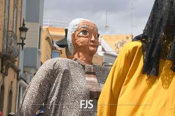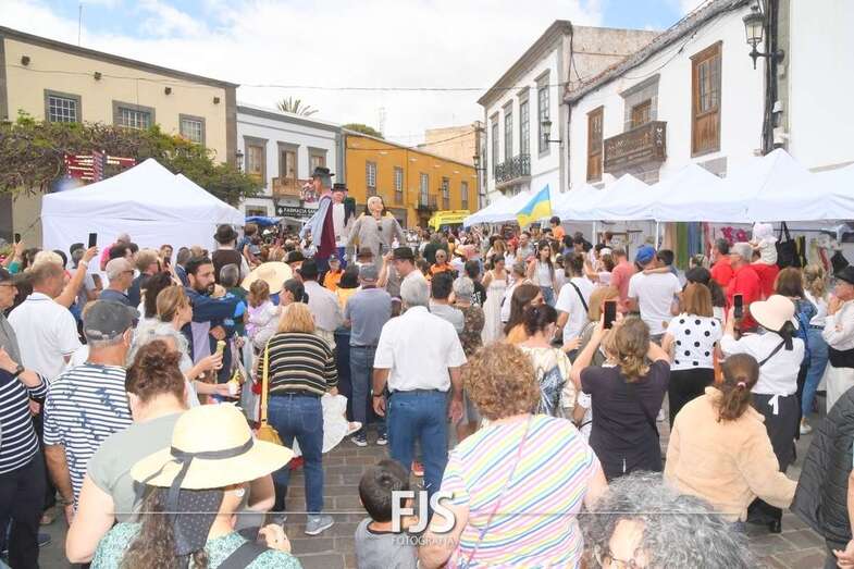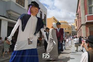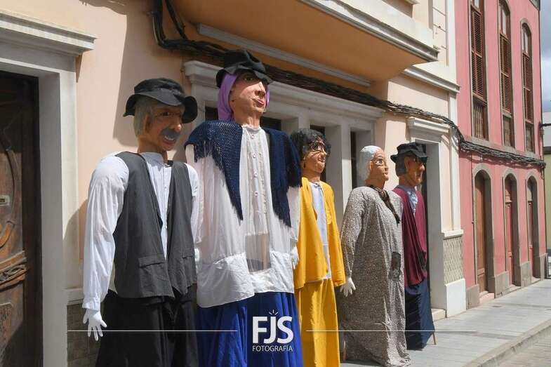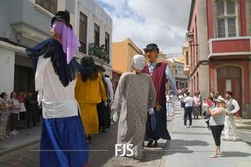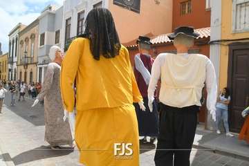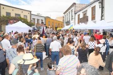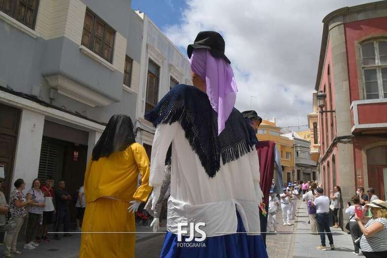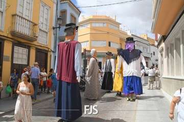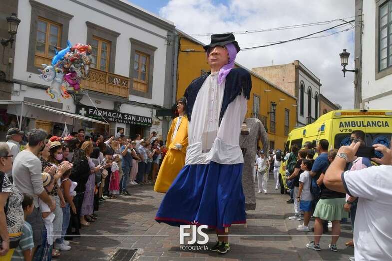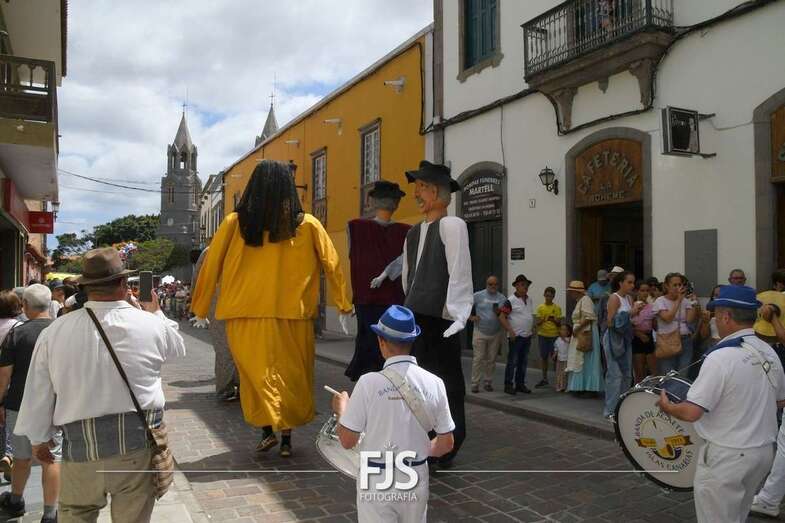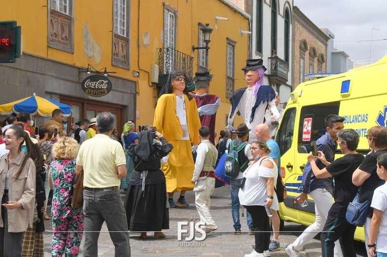 La música pachanguera de la Banda de Agaete, acompañada de un grupo de gigantes y cabezudos, animó este lunes el tramo final de la celebración del Día de Canarias en la plaza de San Juan de Telde.