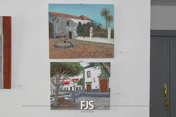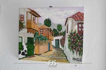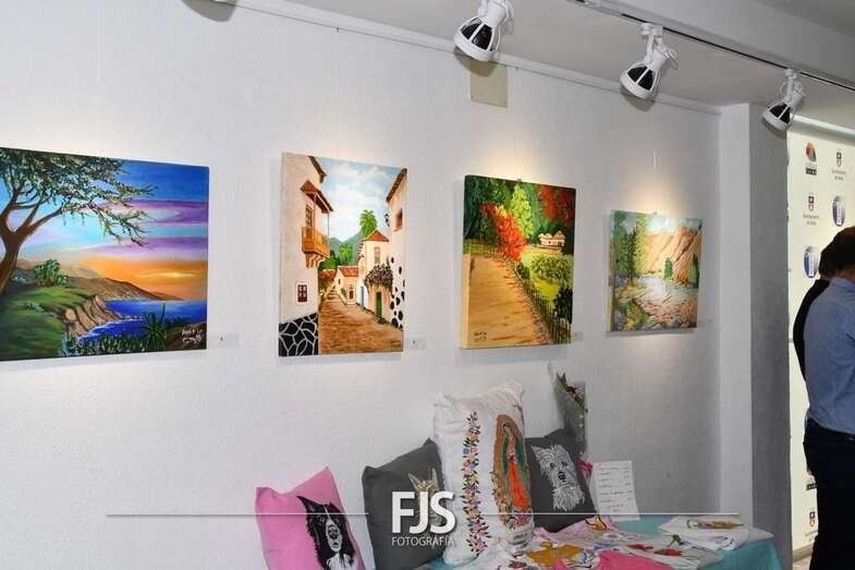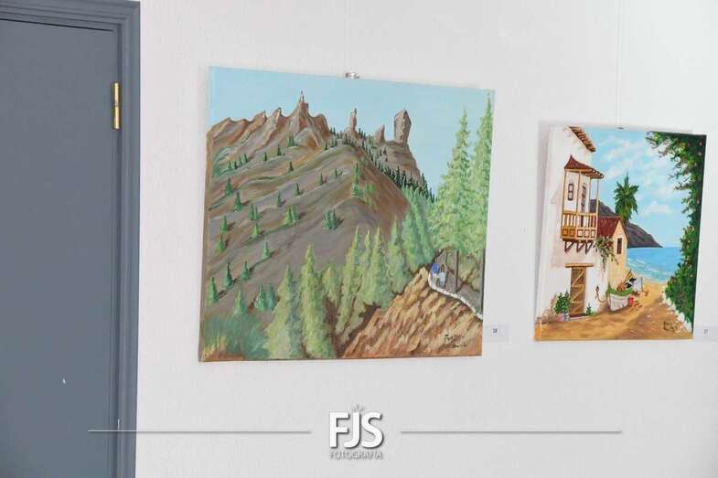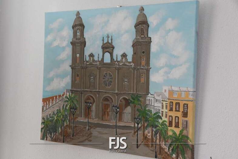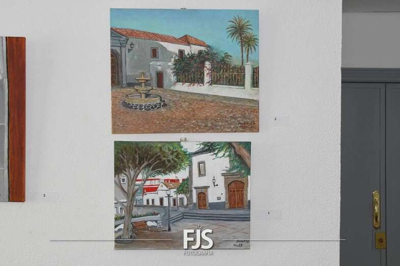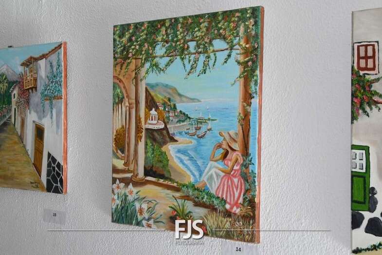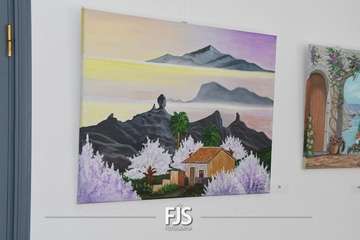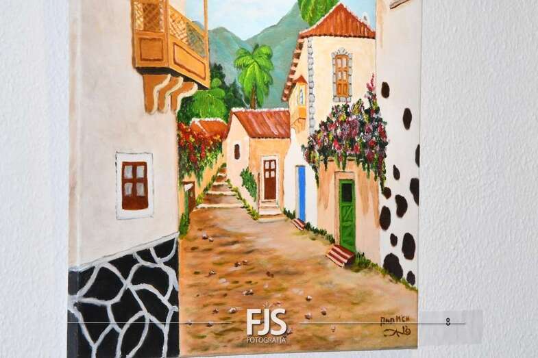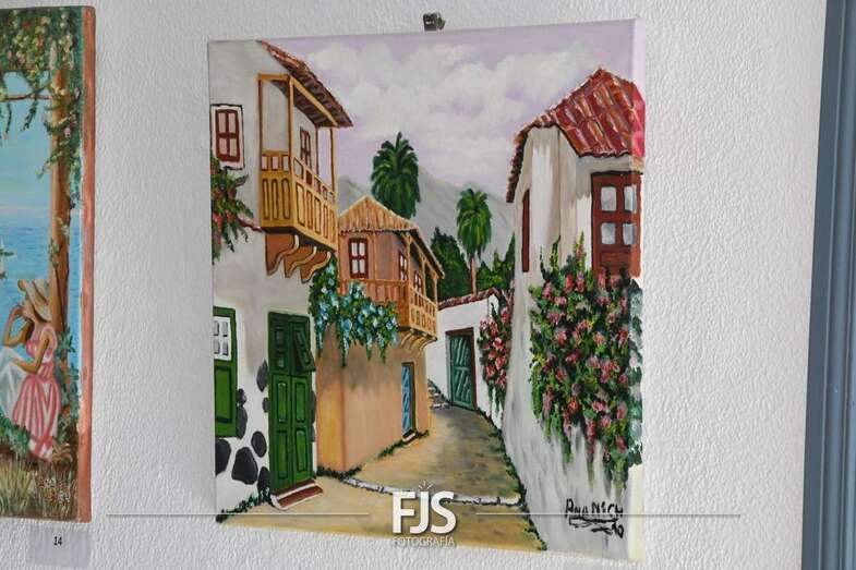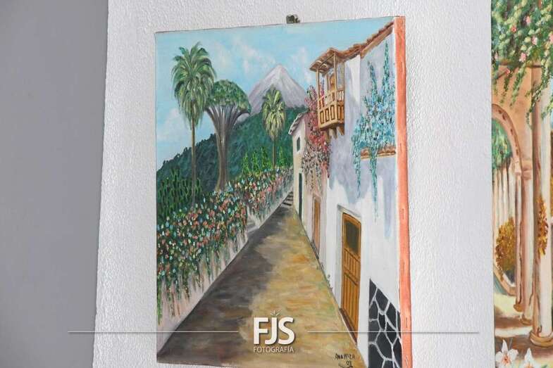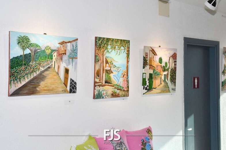 En la muestra, la pintora exhibe sus últimos trabajos, una treintena de lienzos al óleo, bodegones y paisajes canarios, y una pequeña muestra de cojines y camisetas pintadas.