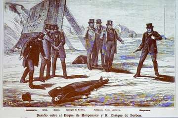Otro acontecimiento que empeora las circunstancias políticas y sociales, tragedia inútil causada por la muerte en duelo en el enfrentamiento a pistola entre Antonio de Orleans, duque de Montpensier, hijo de un rey francés y una princesa española, casado con Luisa Fernanda hermana de la reina y Enrique de Borbón, en el que éste pierde la vida y Montpensier conspirador del derrocamiento de Isabel II, las pretensiones de reinar en España.