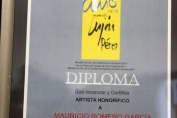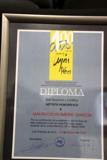 Toma la palabra para hacer entrega del reconocimiento al artista Mauricio Romero García, nace en 1950 en Las Palmas de Gran Canaria en el barrio de Vegueta, desde muy joven muestra una clara tendencia a las Bellas Artes, en su entorno familiar cultivando tanto la pintura, la escultura como la poesía. En 1958 cursa estudios, muy joven, durante varios años en la Escuela Luján Pérez, con carnet acreditativo firmado por el artista Santiago Santana. Tuvo como maestro de pintura a Felo Monzón, Santiago Santana y de escultura a Abraham Cárdenes.