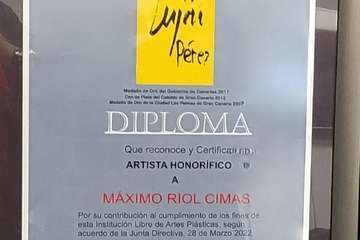 El artista Máximo Riol Cimas, escultor afincado desde hace muchos años en Telde, recibió el pasado 18 de octubre un reconocimiento por parte de la Escuela de Arte Luján Pérez, con su nombramiento como Artista de Honor, junto a Mauricio Romero García.