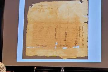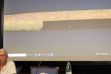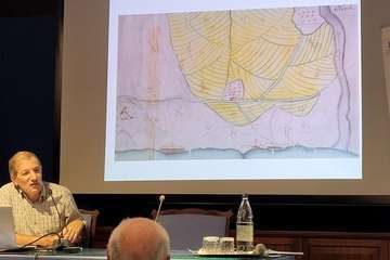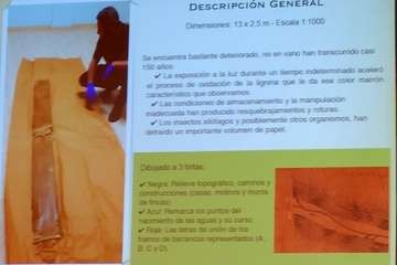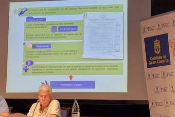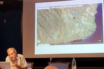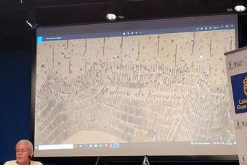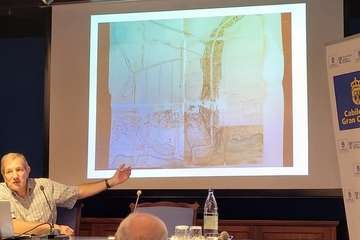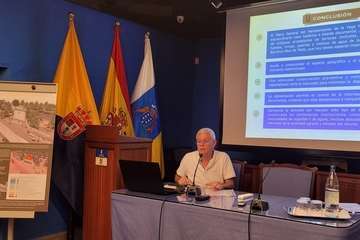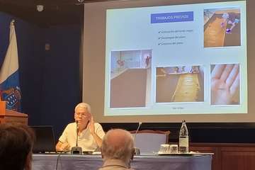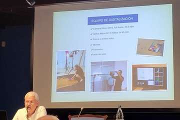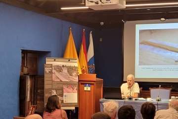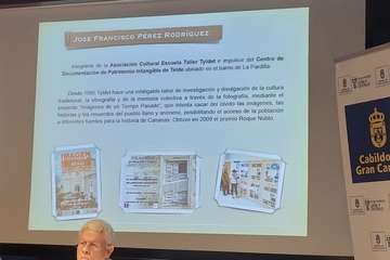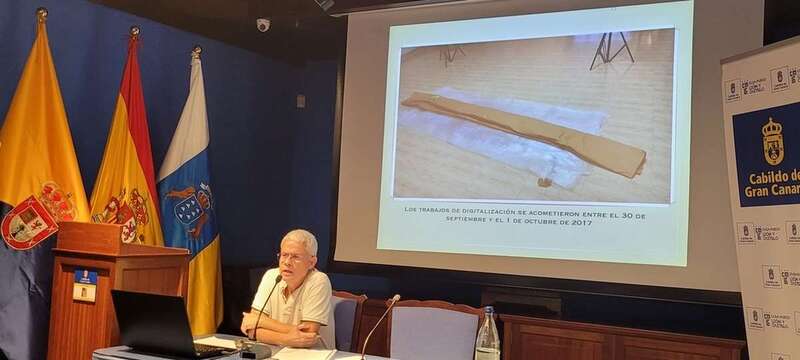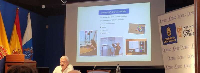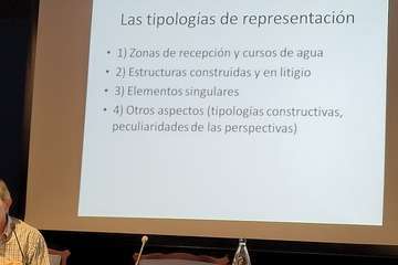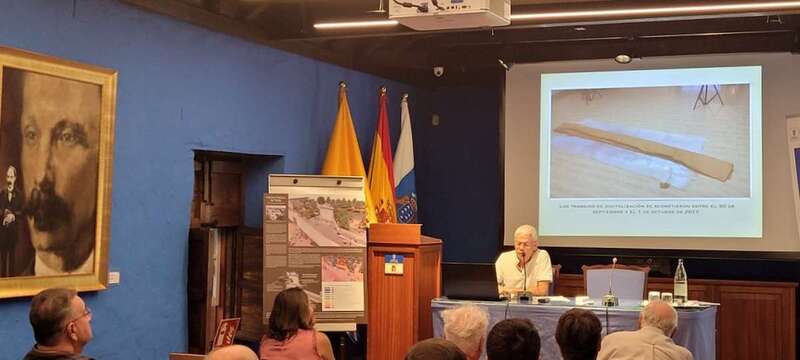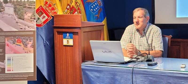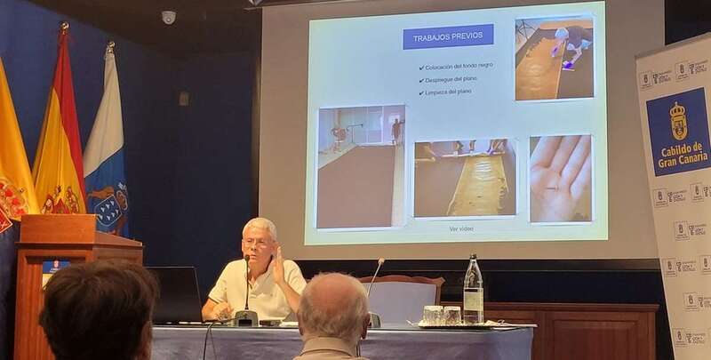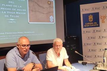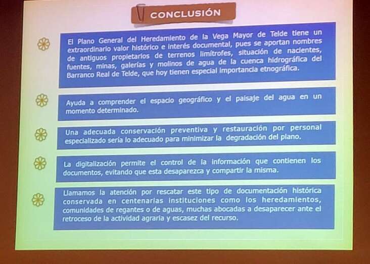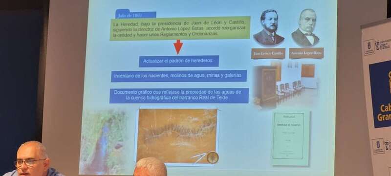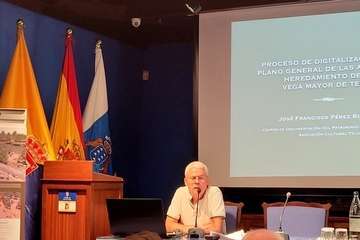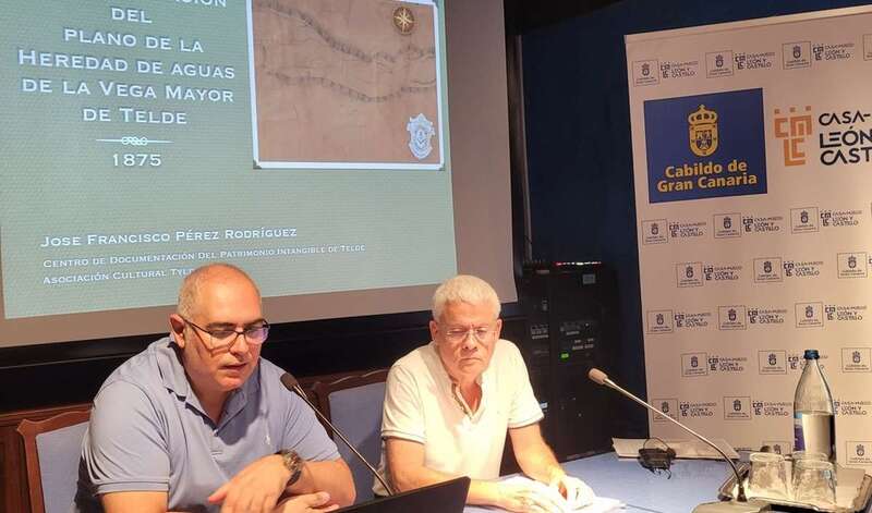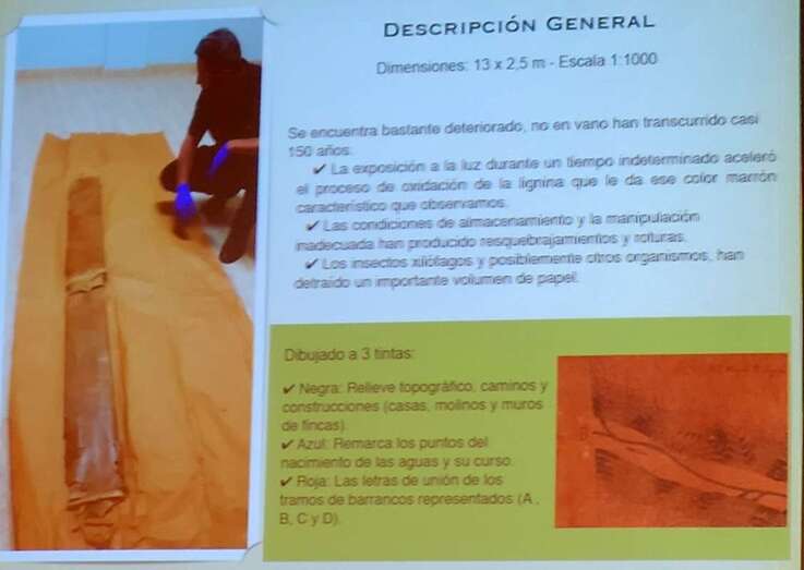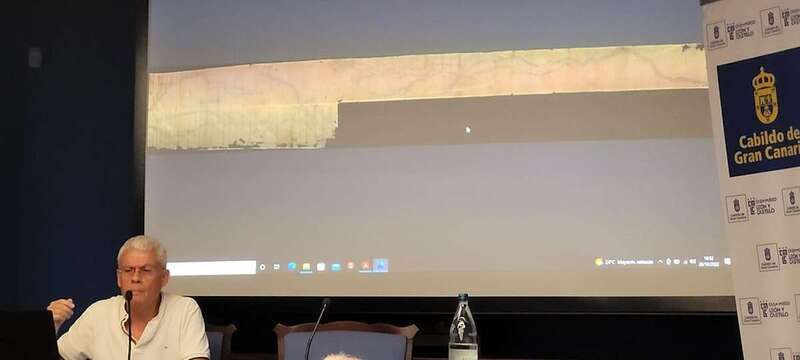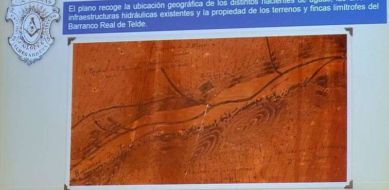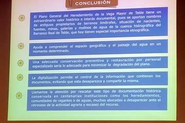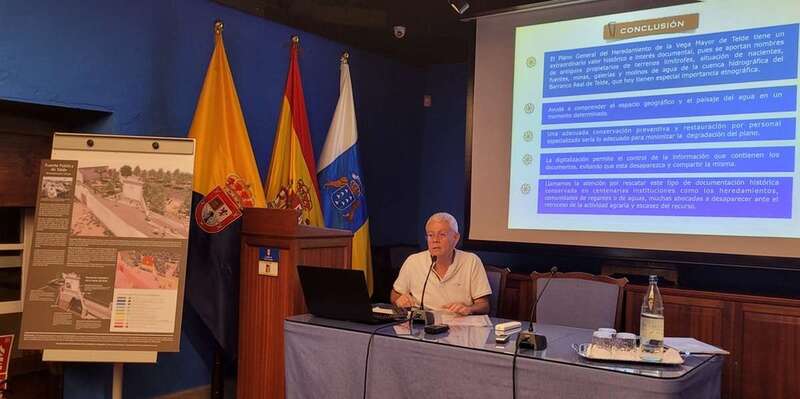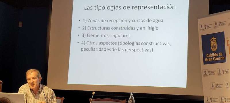 El ponente José Francisco Pérez Rodríguez del Centro de Documentación Intangible de Telde y Colectivo Cultural Tyldet expone los trabajos de rehabilitación, digitalización y Conservación del Plano del Heredamiento de Aguas de la Vega Mayor de Telde de 1874, extraordinario documento que previos los tratamientos expuestos sale a la luz toda la descripción de la cuenca hidrográfica de la Heredad de la Vega Mayor de Telde, que vertebran los actuales municipios de Valsequillo y Telde en un voluminoso plano de 13 metros realizado en 1875 por el arquitecto José Antonio López Echegarreta, en el que se consignan las fuentes, manantiales, remanentes, molinos de agua y obras subterráneas existentes en aquellas fechas.