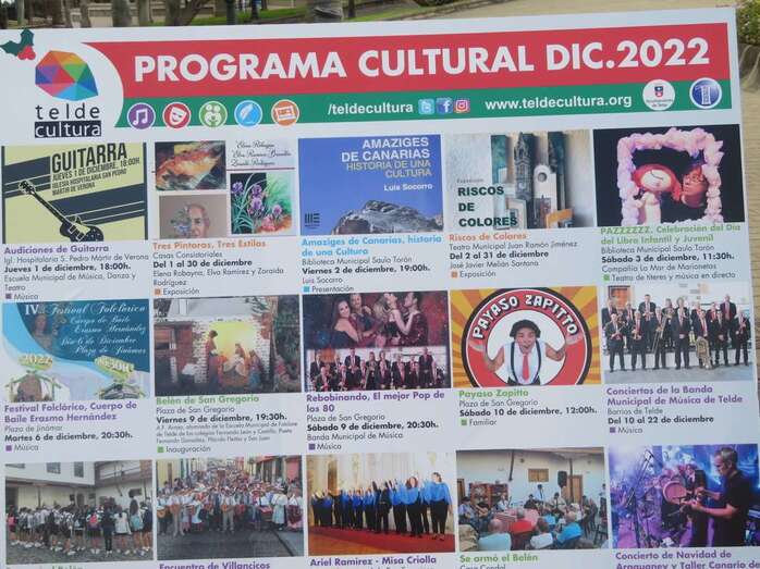 Entre las actividades programadas pueden destacarse la presentación del trabajo de Luis Socorro Amaziges de Canarias, Historia de una cultura, el 2 de diciembre; el espectáculo de Los Dandy’s del Swing, el 23, en San Gregorio; la actuación de Aníbal el Mago y El laboratorio de la risa, los días 27 y 28, respectivamente, en el parque de Arnao; o el concierto de Superabuela, Superpoder, el 3 de enero en la plaza de San Gregorio.