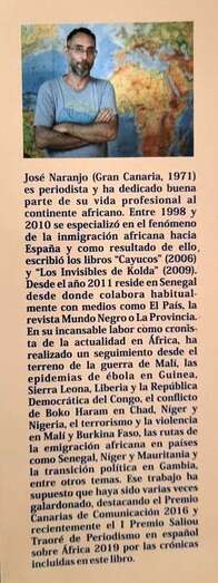 José Naranjo, nace en Telde en 1971. Licenciado en Periodismo por la Universidad Complutense de Madrid en 1994, entre ese año y 2010 trabajó para los periódicos La Provincia, Canarias 7, La Gaceta de Las Palmas y El País y se especializó en el fenómeno de la migración africana hacia España. Ha escrito los libros Cayucos (Editorial Debate, 2006), con el que fue finalista del Premio Debate. Los Invisibles de Kolda (Editorial Península, 2009) y El Río que Desafía al Desierto (Editorial Azulia, 2019).