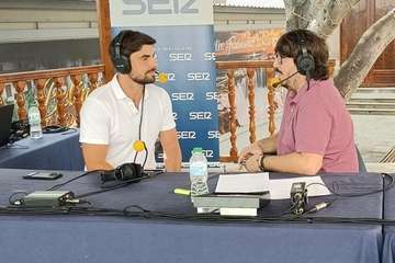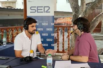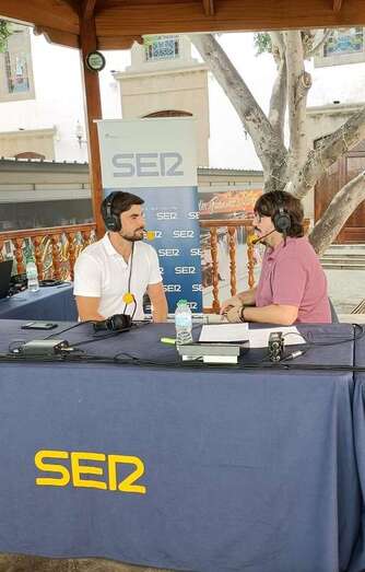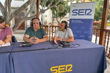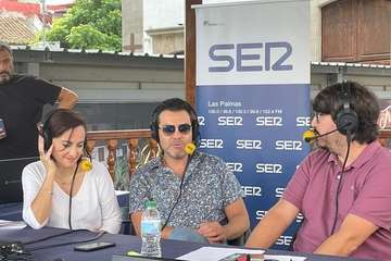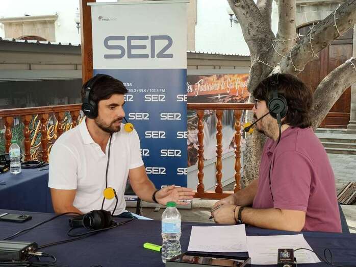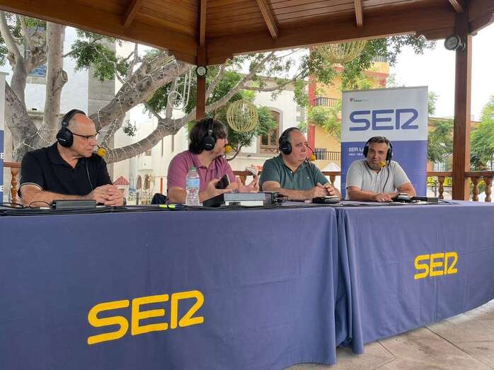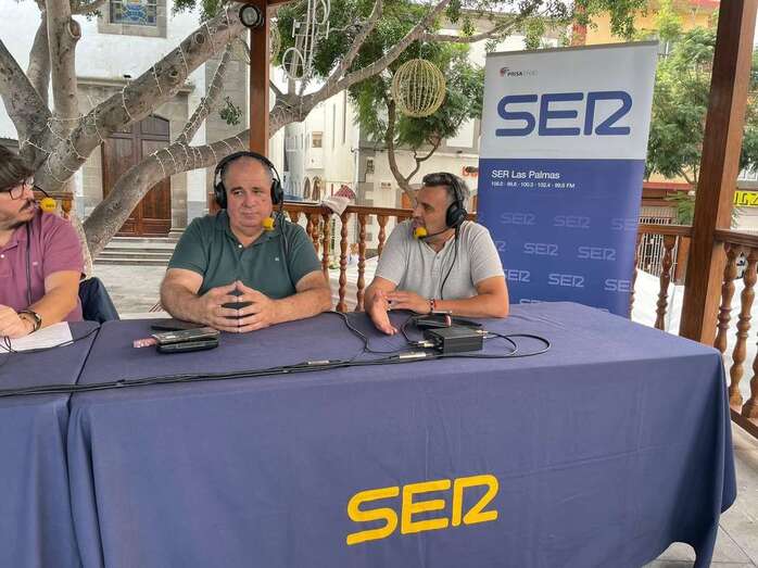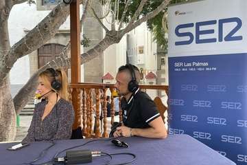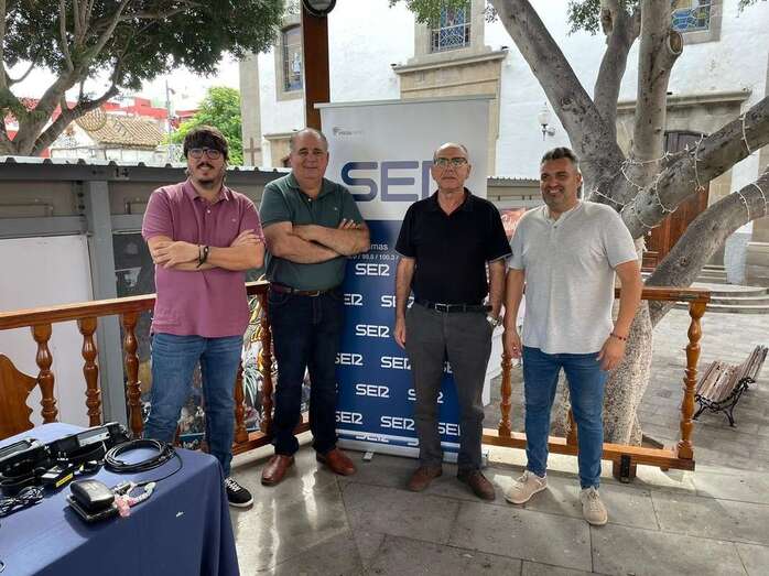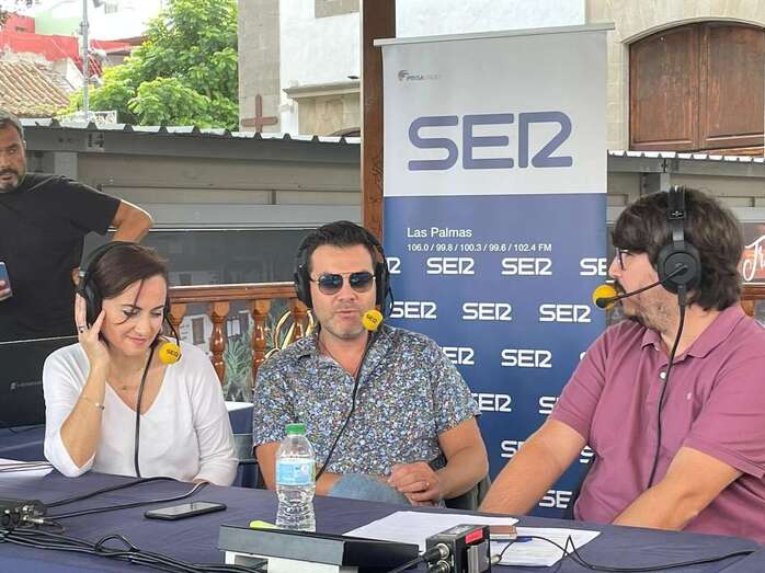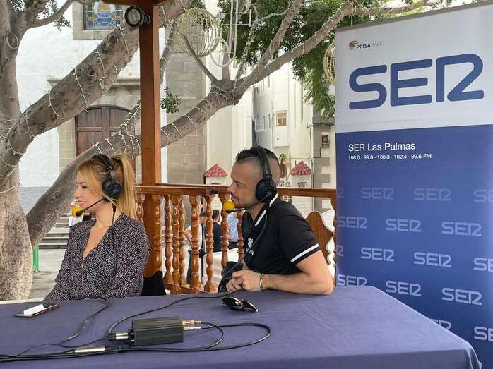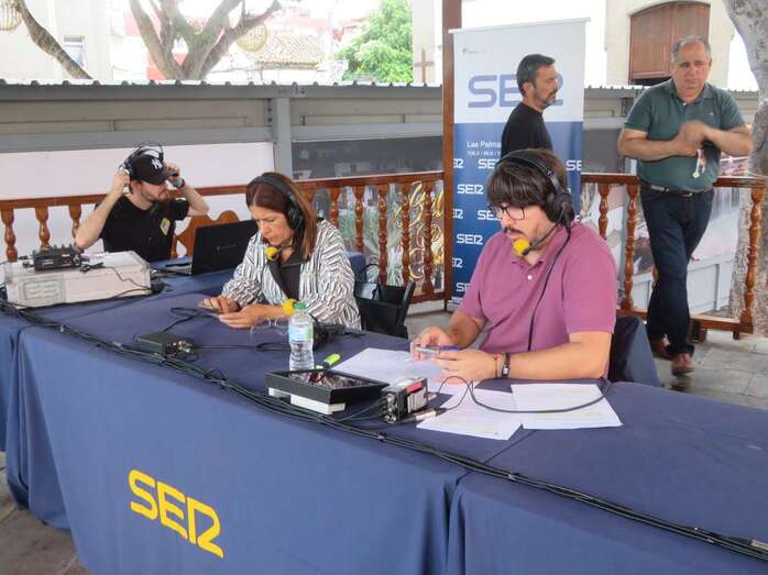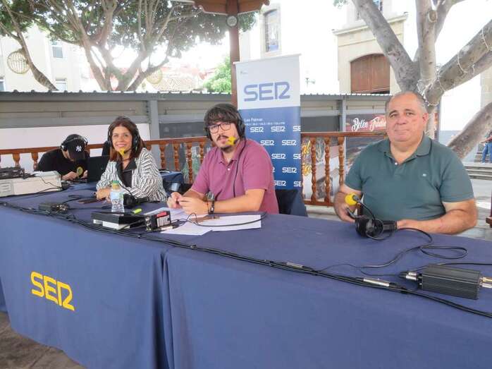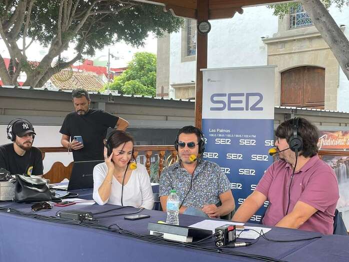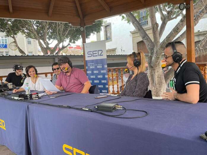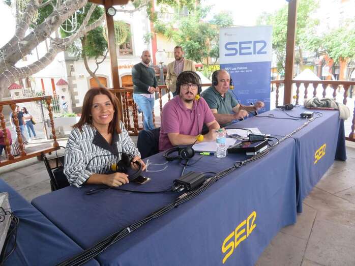 Por los micrófonos del set radiofónico montado por SER Las Palmas pasaron la alcaldesa de Telde, Carmen Hernández; el concejal de Cultura, Juan Martel; el monitor de la Escuela Municipal de Folclore, Salvador Santana; el folclorista y presentador de eventos de música popular canaria, David Peñate; el actor teldense afincado en México, Horacio Colomé, y los cantantes Ángel Bellido, Laia Benaches, Carlos Cabrelles y Aisha Bordas, que participarán esta noche en el espectáculo Rebobinando con la Banda Municipal de Telde.