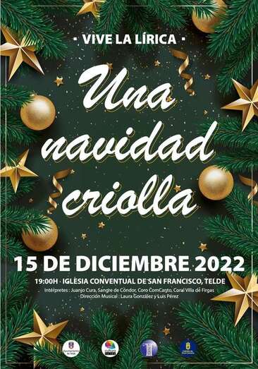 El ciclo Vive la lírica del Ayuntamiento de Telde ofrece el próximo jueves, en la iglesia de San Francisco, el espectáculo Una Navidad criolla, a cargo del grupo de música latinoamericana Sangre de Cóndor junto al solista Juanjo Cura, el coro de cámara del Colegio Oficial de Médicos de Las Palmas y la coral de la Villa de Firgas, bajo la dirección musical de Laura González Machín y Luis Pérez Rivero.