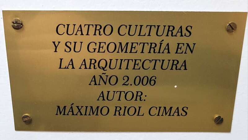 En el pedestal figura la leyenda: Cuatro Culturas y su Geometría en la Arquitectura Año 2006 Autor: Máximo Riol Cimas.