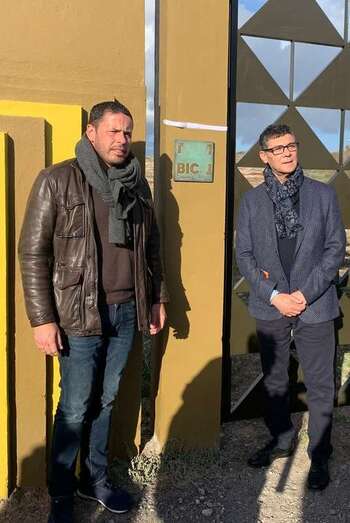 El concejal de Patrimonio, Héctor Suárez, y el director insular de Patrimonio Cultural, Sebastián López, descubrieron este jueves una placa conmemorativa en el yacimiento arqueológico