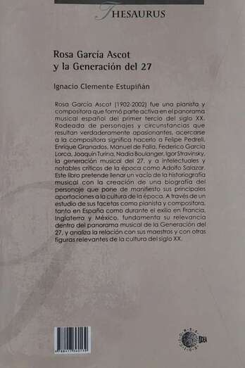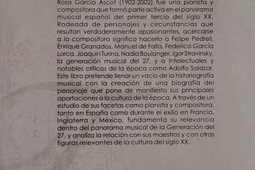 Rosa García Ascot (1902-2002) formó parte activa en el panorama musical español del primer tercio del siglo XX. Se rodeó de personajes y circunstancias que resultan verdaderamente apasionantes. Acercarse a esta compositora significa hacerlo a Felipe Pedrell, Enrique Granados, Manuel de Falla, Federico García Lorca, Joaquín Turina, Nadia Boulanger, Igor Stravinsky, la generación musical del 27, y a intelectuales y notables críticos de la época como Adolfo Salazar.