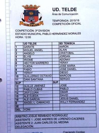 UD Telde: Gárate, Miguel Ángel, Ángelo, Elvis (Guille Jiménez, 69’), Iriome, Héctor Marrero, Dani Ojeda (Javi Luján, 66’), Fabio, Yeray, Guillermo Octavio y Dani Santana (Ale Ojeda, 74’).