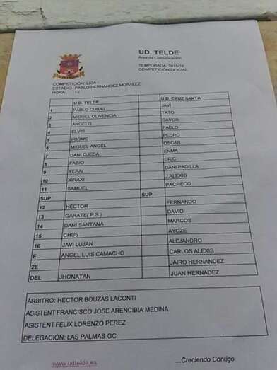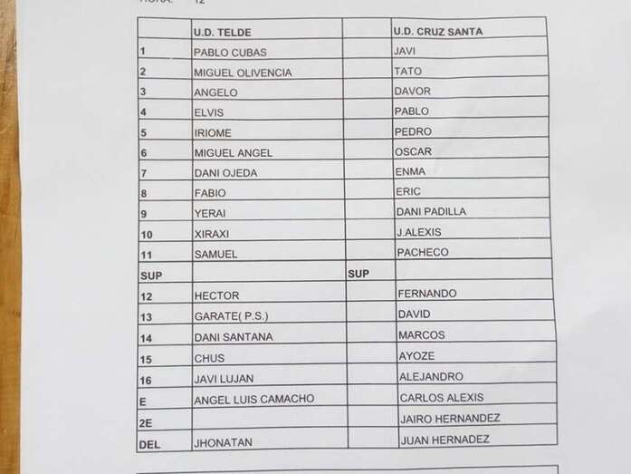 UD Cruz Santa: Javi, Tato, Davor, Pablo, Pedro, Óscar, Enma, Eric (Ayoze, 73'), José Alexis, Pacheco (Fernando, 82') y Dani Padilla (Marcos, 65')