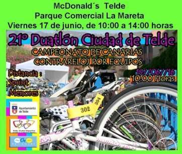 XXI edición del Duatlón Ciudad de Telde, prueba puntuable para el Campeonato de Canarias Contrarreloj y que se disputará este domingo en el entorno de la circunvalación GC-100 y del parque urbano de San Juan. El reparto de números se llevará a cabo, de 10 a 14 horas, en las instalaciones de McDonald´s Telde, en el Parque Comercial La Mareta.