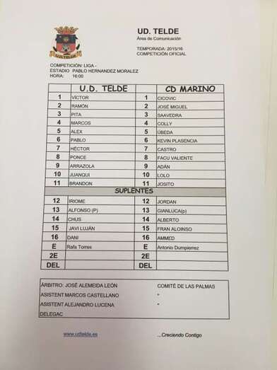 UD Telde: Víctor; Ramón, Pita, Marcos, Alex, Pablo, Héctor, Ponce, Javier (Iriome, minuto 80), Juanqui (Javier, minuto 58) y Brandon (Chus, minuto 53).
