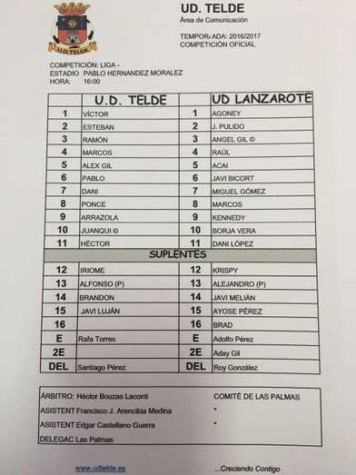 UD Telde: Víctor, Esteban (Iriome, descanso), Ramón, Marcos, Alex Gil, Pablo, Dani, Ponce, Arrazola (Javi Luján, minuto 76), Juanqui y Héctor.