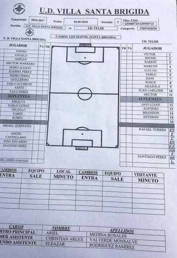 Villa de Santa Brígida: Fermín, Ángelo, Adrián, Héctor Marrero, Pedro Alemán, Juanma Pérez, Guillermo, Pedro Pérez (Trujillo, 71'), Facu (Ribalta, 63'), Santi (Fabio, 77') y Pablo Álvarez.