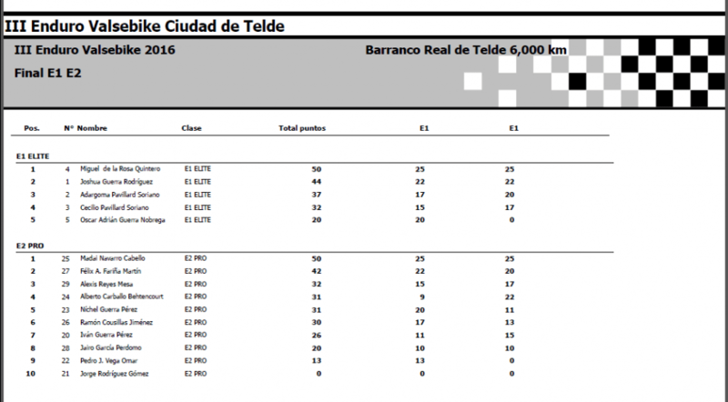 Seis kilómetros repletos de obstáculos donde todos los participantes tuvieron que sacar a relucir toda su técnica de pilotaje para poder aspirar a los puestos de cabeza que se vendieron muy caros en las principales categorías. Así, en E1 Elite Miguel de la Rosa fue el hombre a batir y lo demostró llevándose las dos mangas con, prácticamente, un minuto de ventaja en ambos casos sobre Joshua Guerra, segundo clasificado. Adargoma Pavillard pisó podio en esta categoría en la segunda de las mangas, mientras en la primera fue Óscar Guerra quien ocupó esa primera posición. Cecilio Pavillard fue quinto y cuarto.