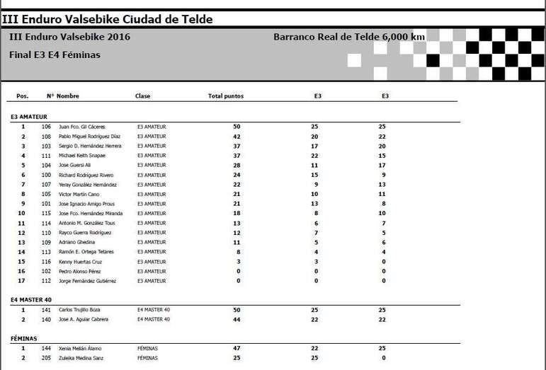 En E3 Amateur, Juan Francisco Gil le tomó la medida a esos seis kilómetros de recorrido para llevarse las dos mangas, en la primera ante la oposición de Michael Keith Snapae y la segunda frente a Pablo Miguel Rodríguez, que se mantuvo siempre en posiciones de honor. Sergio Hernández obtuvo la tercera posición en la segunda carrera por lo que, a los puntos, quedó tercero en el global por delante de Michael Keith Snapae y José Guersi.