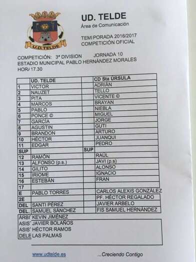 Unión Deporiva Telde: Víctor, Nau, Pita, García, Ponce, Marcos, Pablo, Agustín (Esteban, 81’), Brandon, Héctor (Gilito, 56’) y Édgar (Ramón, 62’).