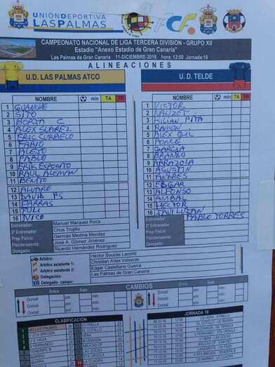 UD Telde, 0: Víctor, Nauzet, Kilian, Ramon, Álex Gil, Ponce, García, Brando, Arrazola, Agustín y Andrés. Banquillo: Edgar, Alfonso, Aníbal, Héctor, Javi Luján.